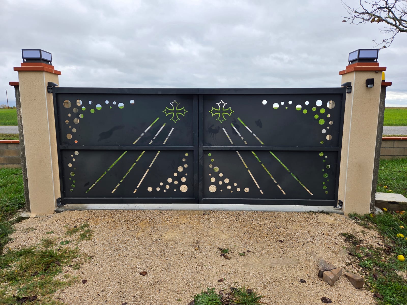 Avec notre machine de découpes PLASMA à commande numérique, nous pouvons découper des motifs personnalisables dans des tôles jusqu’à 4 ml. Tous les portails coulissants inférieurs ou égaux à 4 ml peuvent donc être fabriqués sans renfort central.